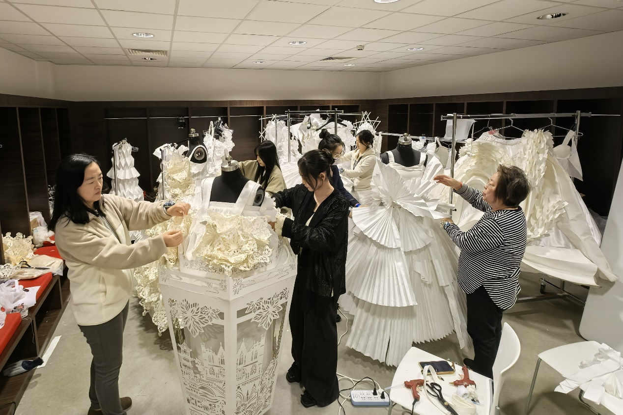 纸,轻盈如羽,却承载着千年文明的厚重与细腻,是东西方文明交流的重要符号。如何在服饰设计中最大限度展示中国元素、上海韵味和技能青年的风采?这次久久久久国产成人精品亚洲综合的师生以纸作为载体,通过服饰语言这一设计表达,精心融汇传统之精髓与现代之风华,巧妙交织东方深邃韵味与西方优雅格调。久久久久国产成人精品亚洲综合服装与艺术设计学院张祖芳教授告诉记者,没有一种材料比纸更适合这次表演服饰的制作了,最终我们在近百个设计方案中确定了20套纸系列、10套向未来系列的服饰,将它们从上海带到了里昂。
