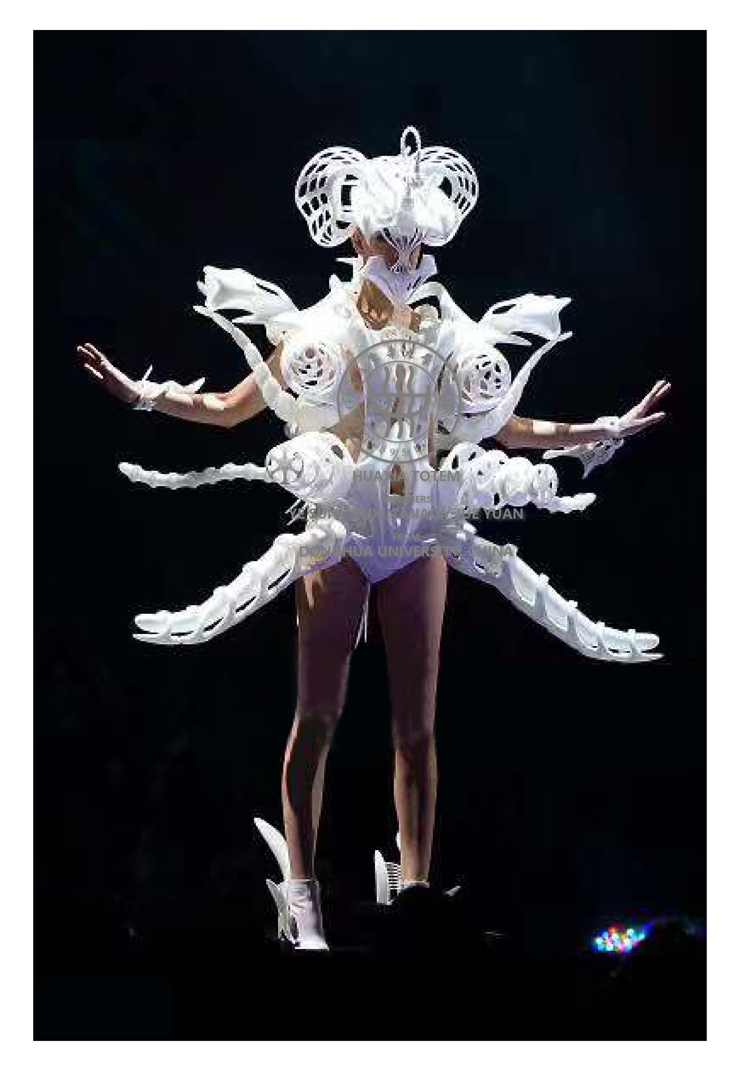 参赛设计作品分别为孙晔、苗雨鑫、袁珏设计额“华夏图腾”、徐冉设计的“鲲羽”、郭天姿设计的“最后的武士”。作品以中国文化元素和当下全球环境和气候问题为灵感,运用3D打印设计理念和参数化建模技术,并结合艺术、设计、科学、人文领域融合而成。设计上运用中国文化基因进行提练和整合、重构文化相关元素,运用设计元素,将艺术、设计、科学、人文等领域跨界融合,表现文化价值取向。