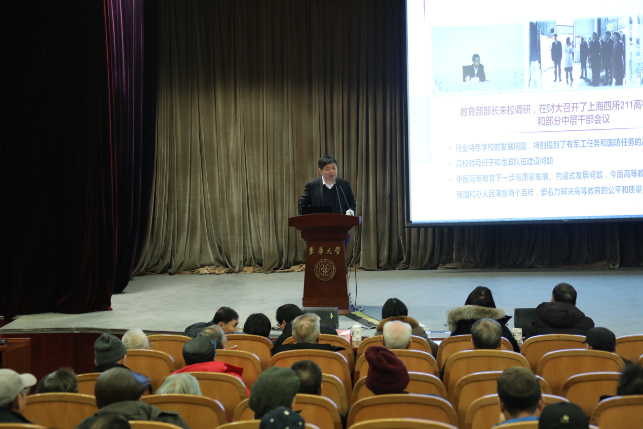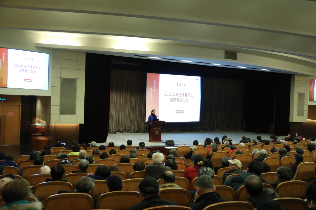 1月13日上午,学校2020年离退休老同志迎新春报告会在延安路校区举行,校党政领导与离退休老领导、老同志们欢聚一堂,再叙情谊,共谋发展,喜迎新春。党委书记刘承功、校长俞建勇出席报告会,会议由党委副书记崔运花主持。