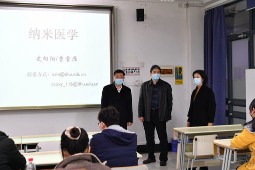 在《结构化学》《纳米医学》和《功能高分子材料》课前,俞建勇分别与化工生物学院鲁希华老师、史向阳老师和材料学院陈龙老师亲切交谈,了解新学期学生到校上课情况,仔细询问教学准备情况和课程设置,关心教学工作需求,希望老师们在疫情防控常态化背景下对新学期的教学内容提前预判、系统谋划,合理安排好线上和线下教学,提升教育教学水平,让学生学有所得、学有所获。俞建勇充分肯定了师生在新学期展现出的良好精神面貌,希望同学们回归校园后,珍惜宝贵的学习时光,合理规划学业,拓展专业视野,不断提升能力素养。